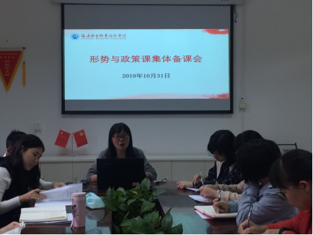 為了進一步實落細集體備課精神,切實提高教師的專業(yè)素養(yǎng)和教學能力,繼續(xù)提升課堂教學質(zhì)量,2019年10月31日上午,形勢與政策教研室在行政樓107室召開集體備課專題會。本次會議由形勢與政策教研室主任丁愛芝主持,馬克思主義學院院長熊美蘭、形勢與政策教研室全體教師參加了備課會。