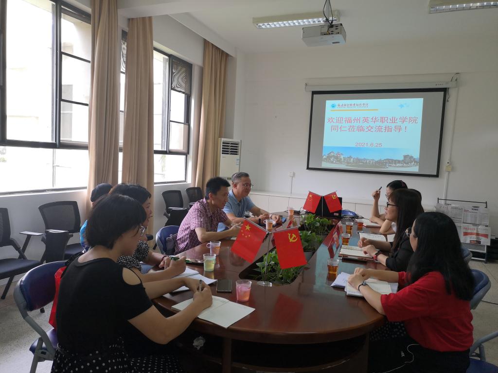 2021年6月25日上午,福州英華職業(yè)學(xué)院黨委副書記陳玉池一行6人來我校馬克思主義學(xué)院進(jìn)行調(diào)研交流,馬克思主義學(xué)院院長熊美蘭、副院長來朋珍、辦公室主任楊盈等熱情接待。