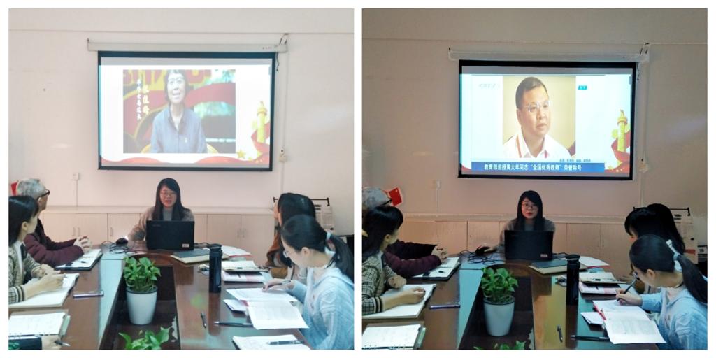 在觀看學習“時代楷?!睆埞鹈?、黃大年的師德優(yōu)秀典型先進事跡后,教師張晨琳、楊央、朱麗燊、王康分別分享了學習心得。