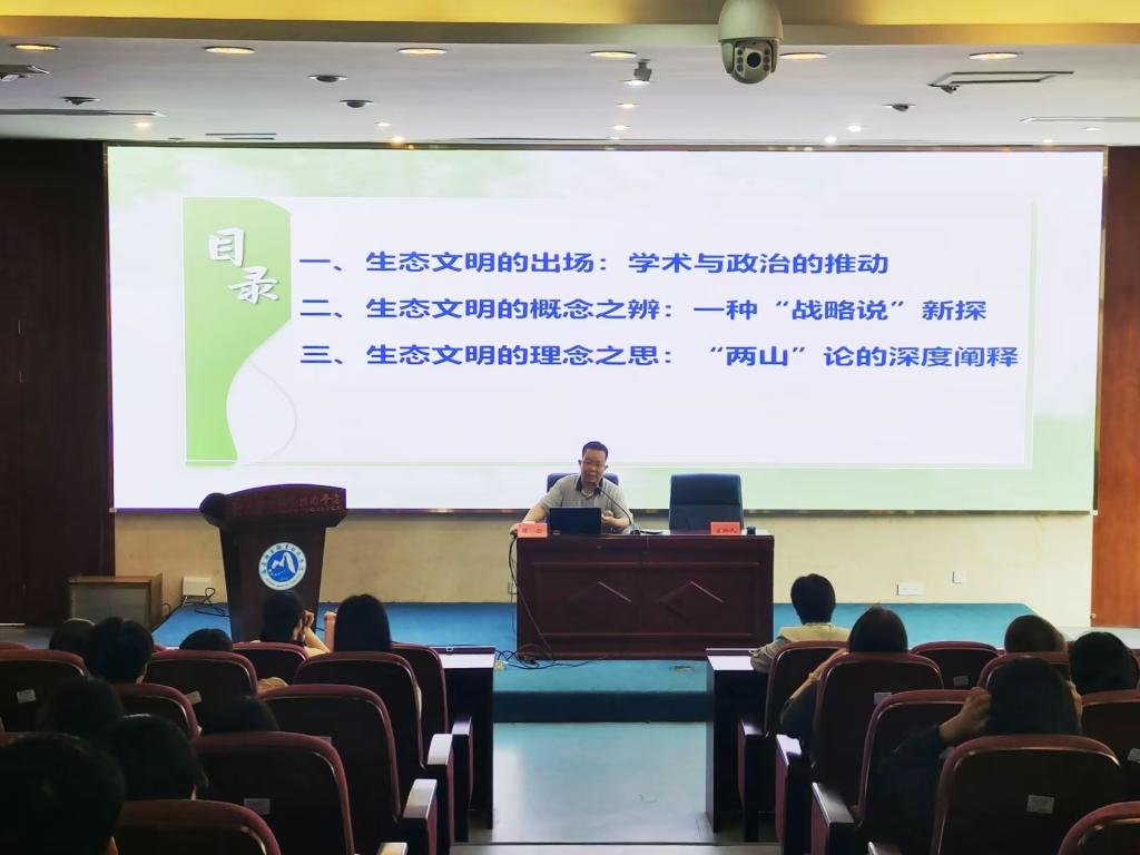習(xí)近平總書(shū)記強(qiáng)調(diào),發(fā)揮我國(guó)哲學(xué)社會(huì)科學(xué)作用,要注意加強(qiáng)話語(yǔ)體系建設(shè)。建設(shè)生態(tài)文明,是我們黨提出的具有原創(chuàng)性、時(shí)代性的概念和理論。為幫助我校師生從學(xué)理上加深對(duì)綠水青山何以就是金山銀山的辯證理解,推動(dòng)建設(shè)人與自然和諧共生的現(xiàn)代化,2024年10月10日,馬克思主義學(xué)院邀請(qǐng)福建師范大學(xué)馬克思主義學(xué)院陳云教授在篤行樓四樓報(bào)告廳開(kāi)展《新時(shí)代生態(tài)文明理論研究:概念、理念與話語(yǔ)》的專題講座。講座由馬克思主義學(xué)院副院長(zhǎng)來(lái)朋珍主持,馬克思主義學(xué)院全體專兼課教師、學(xué)生代表參加。