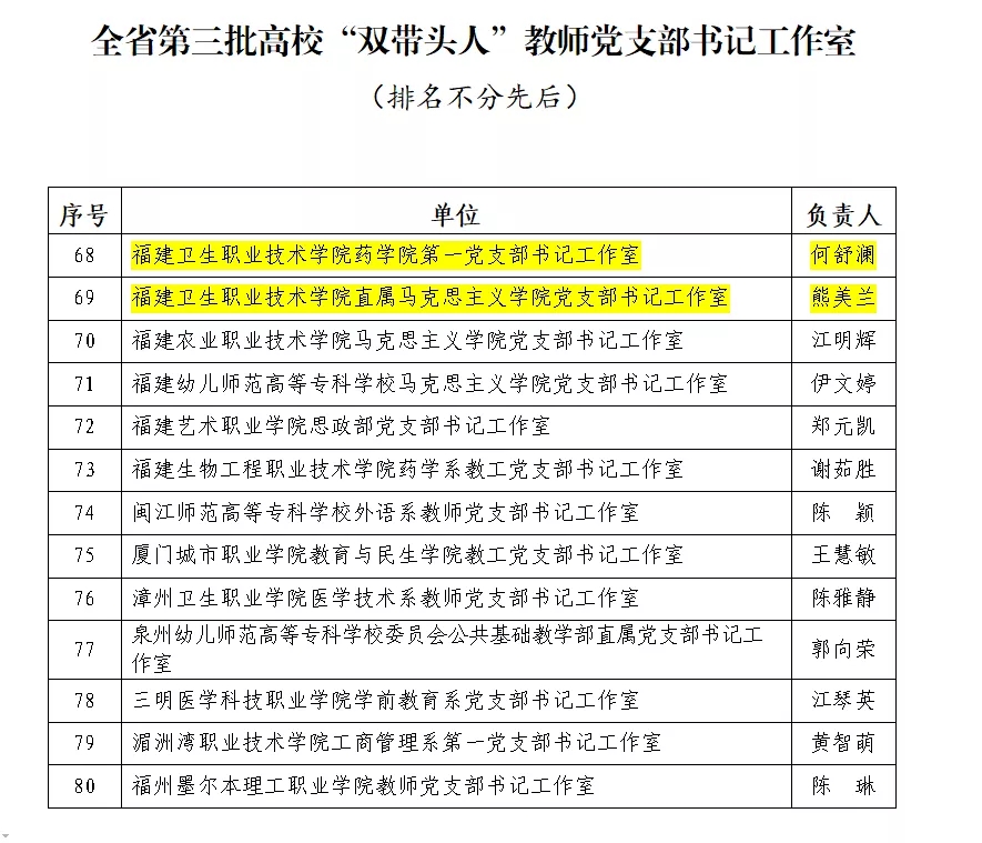 近日,省委教育工委公布了第三批高?!半p帶頭人”教師黨支部書(shū)記工作室培育建設(shè)名單,我校藥學(xué)院第一黨支部和直屬馬克思主義學(xué)院黨支部?jī)蓚€(gè)工作室成功入選。這是繼我校6個(gè)黨組織入選全省黨建工作標(biāo)桿院系、樣板支部培育創(chuàng)建單位后,持續(xù)推進(jìn)新時(shí)代高校黨建示范創(chuàng)建和質(zhì)量創(chuàng)優(yōu)工作取得的新成效。