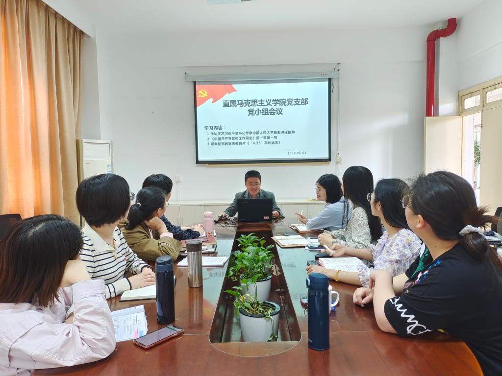 2022年5月5日,直屬馬克思主義學(xué)院黨支部第一黨小組在會議室107開展理論學(xué)習(xí)活動,本次理論學(xué)習(xí)的主要內(nèi)容有:傳達(dá)學(xué)習(xí)習(xí)近平總書記考察中國人民大學(xué)重要講話精神、《中國共產(chǎn)黨宣傳工作簡史》,觀看反邪教宣傳教育片《“4.25”事件始末》。活動由黨支部副書記來朋珍同志主持。