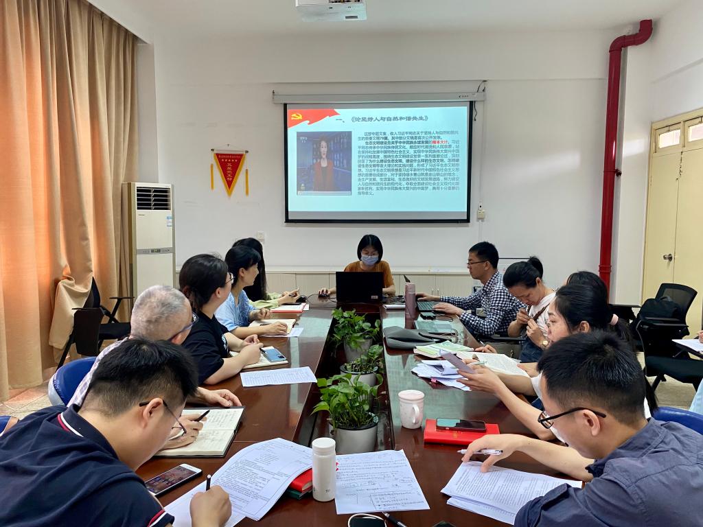在羅蕓的帶領(lǐng)下,大家認(rèn)真學(xué)習(xí)了《論堅(jiān)持人與自然和諧共生》《閩山閩水物華新——習(xí)近平福建足跡》,并針對(duì)習(xí)近平生態(tài)文明思想融入思政課教學(xué)進(jìn)行了交流研討。