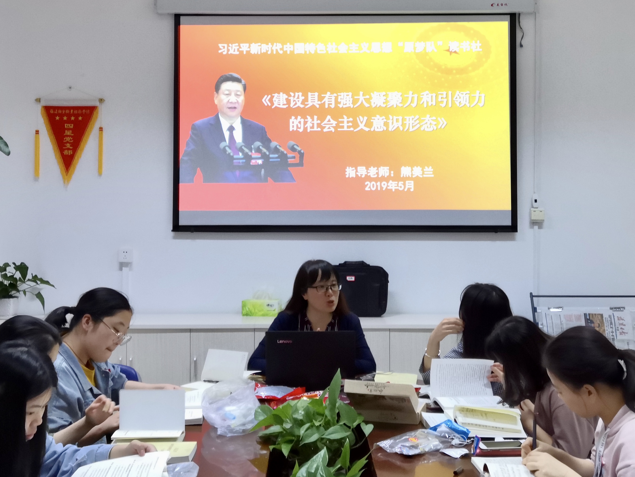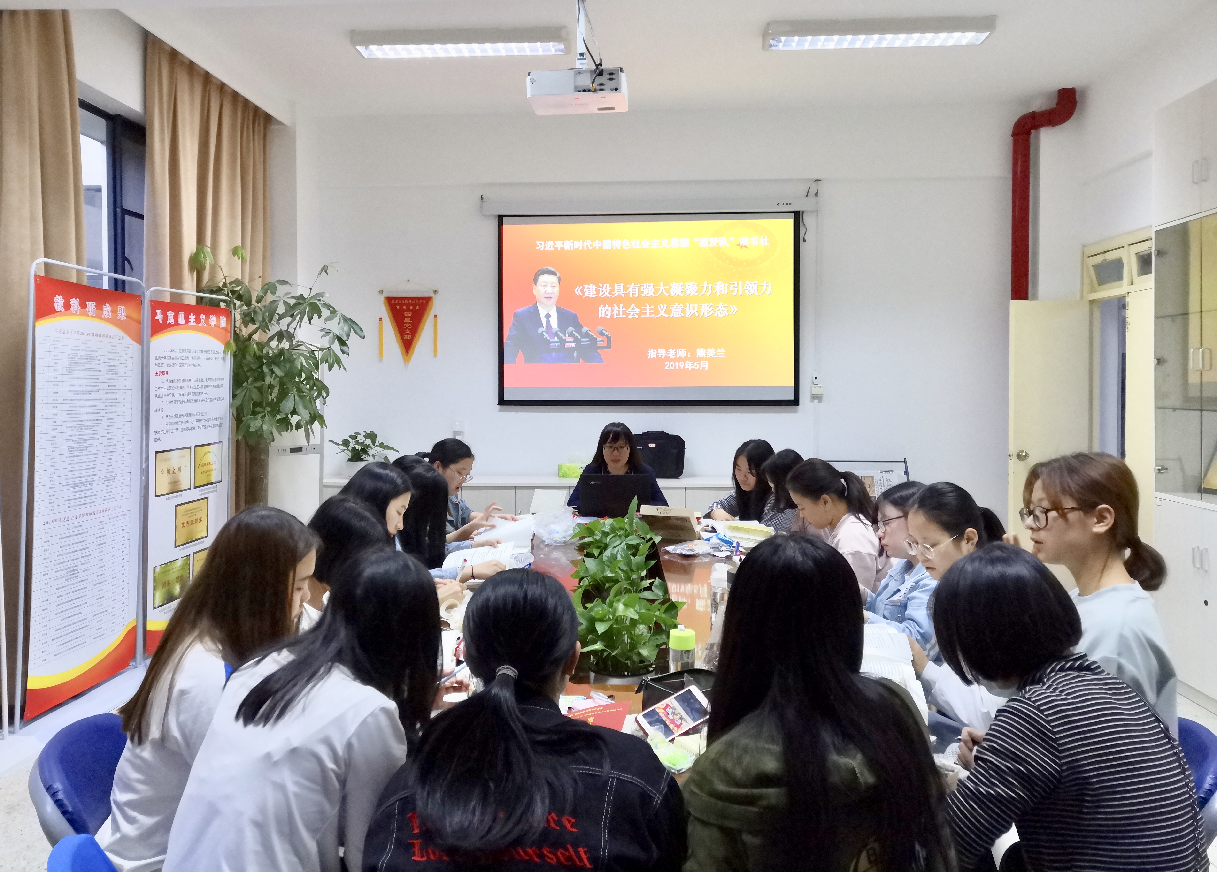 為學習貫徹《習近平新時代中國特色社會主義思想三十講》第十九講之牢牢掌握意識形態(tài)工作領導權(quán)及堅決打贏網(wǎng)絡意識形態(tài)斗爭的精神,我院習近平新時代中國特色社會主義思想讀書社原夢隊,于2019年5月7日18:30,在馬院研討室召開了專題學習會,由馬院院長、指導老師熊美蘭主講。