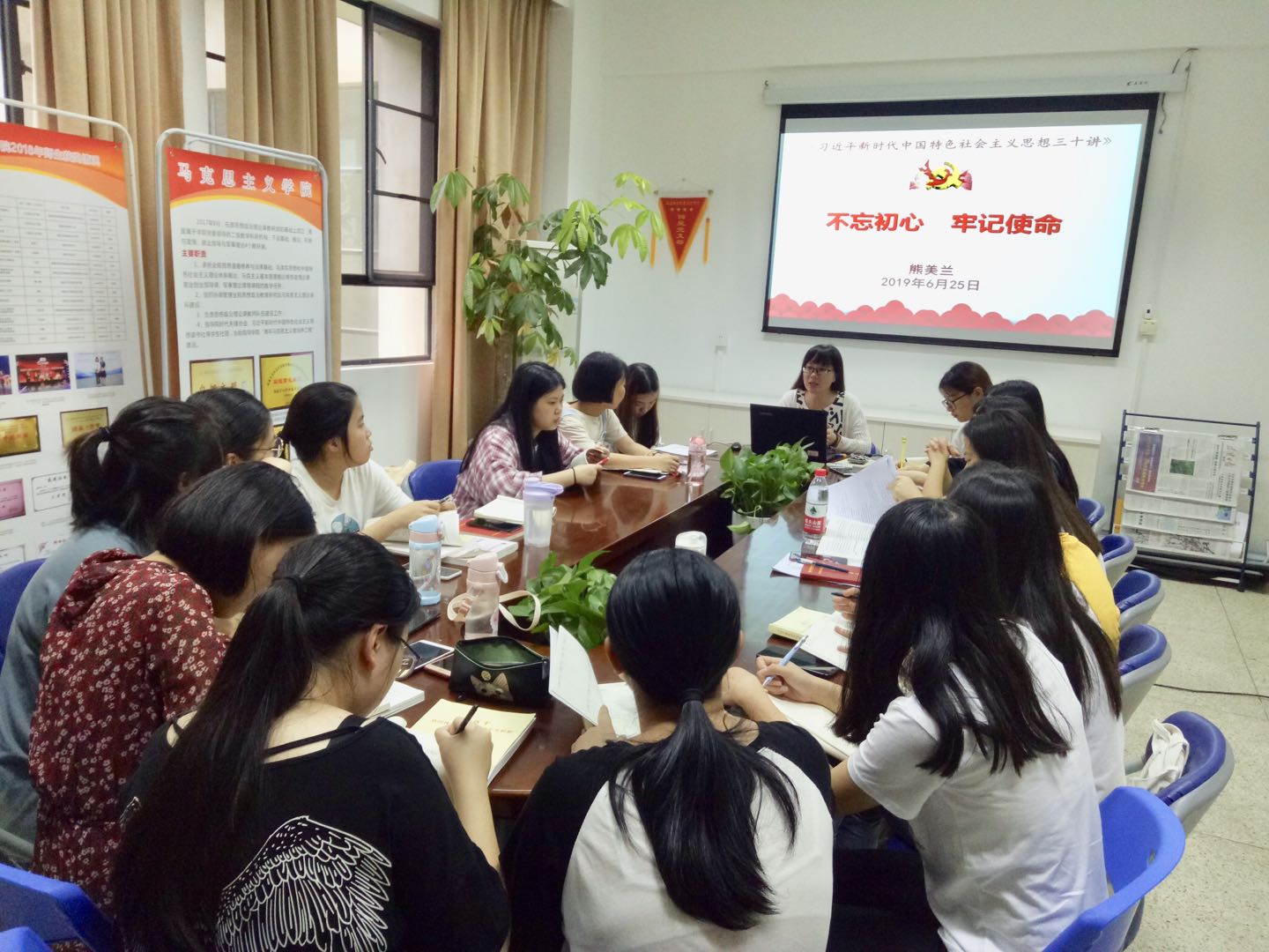 為學(xué)習(xí)貫徹《習(xí)近平新時代中國特色社會主義思想三十講》精神,習(xí)近平新時代中國特色社會主義思想讀書社原夢隊(duì)全體同學(xué)于2019年6月25日晚上,在馬院研討室上了本學(xué)期最后一次課,聽取熊美蘭老師作題為“不忘初心、牢記使命”專題報(bào)告,并結(jié)合同學(xué)的新思想學(xué)習(xí)和學(xué)業(yè)攻讀進(jìn)行了討論。