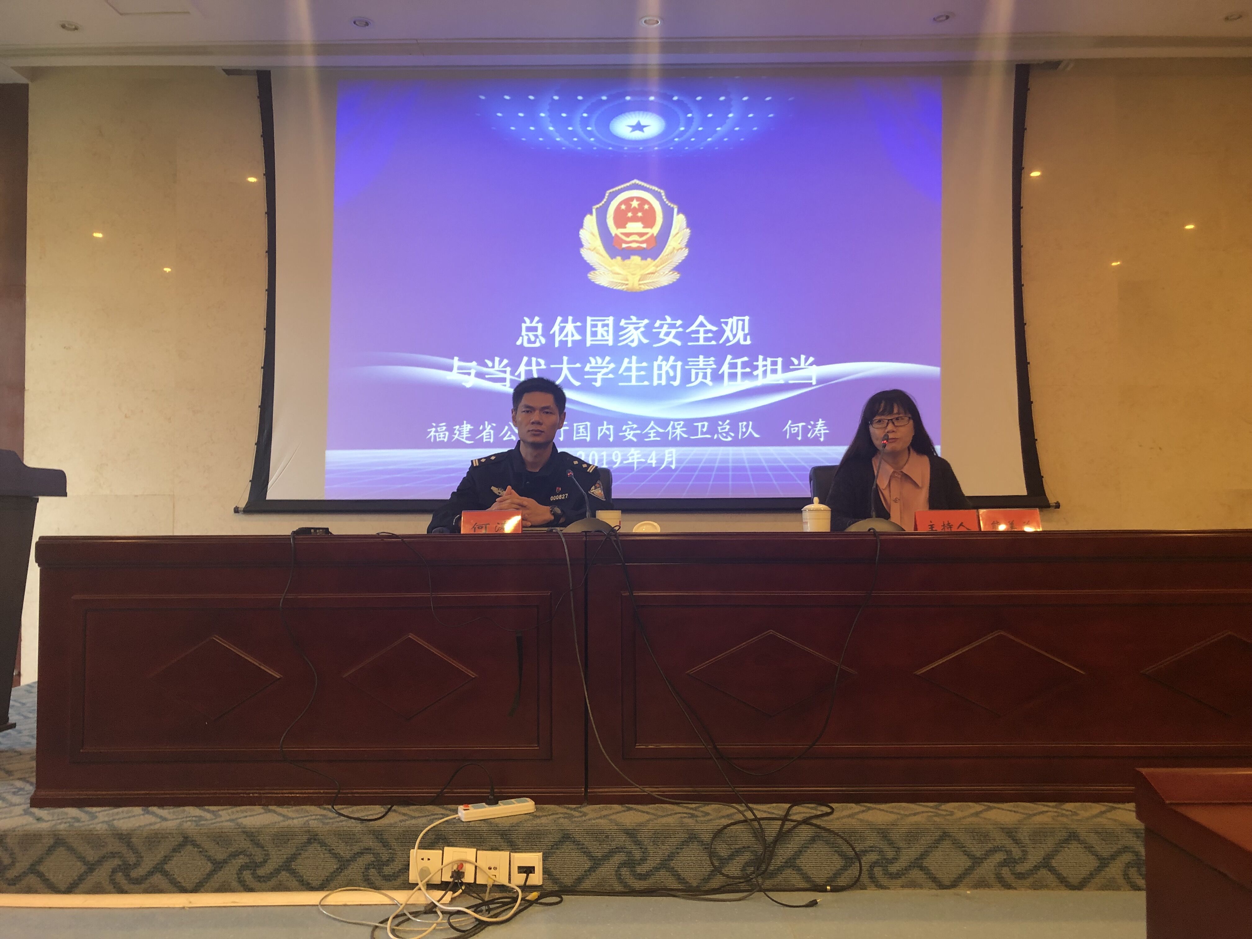 為深入學(xué)習(xí)貫徹習(xí)近平新時代中國特色社會主義思想,堅持總體國家安全觀,著力防范化解重大風(fēng)險,結(jié)合福建衛(wèi)生職業(yè)技術(shù)學(xué)院4·15國家安全日教育系列活動要求,于2019年4月18日下午,福建省公安廳一級警長何濤受邀在實訓(xùn)樓四樓報告廳為廣大師生開設(shè)題為《總體國家安全觀與當(dāng)代大學(xué)生的責(zé)任擔(dān)當(dāng)》的專題講座。講座由馬克思主義學(xué)院院長熊美蘭主持,思想政治理論課教師,習(xí)近平新時代中國特色社會主義讀書社、時代先鋒協(xié)會等馬克思主義理論學(xué)生社團成員,校輿情引導(dǎo)隊和藥學(xué)系等學(xué)生代表等共230多人參加了此次講座。