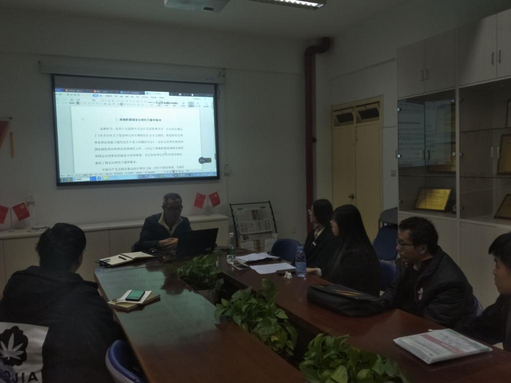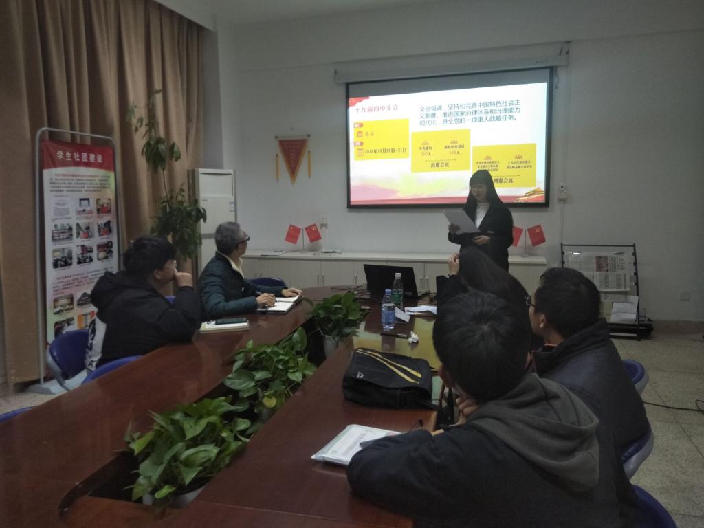 2019年12月12日晚,讀書社宣講團(tuán)成員聚集在行政樓107馬克思主義學(xué)院會(huì)議室,共同討論學(xué)習(xí)黨的十九屆四中全會(huì)精神,并舉行內(nèi)部宣講。