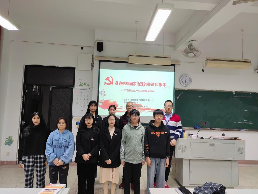 活動開始,由胡濟(jì)林老師向大家簡要介紹馬克思主義學(xué)院新成立的習(xí)近平新時代中國特色社會主義思想讀書社宣講團(tuán)的職責(zé)和使命,并歡迎同學(xué)報名參加。接著,胡老師說最近一段時期黨和國家政治生活中的一件大事是,中國共產(chǎn)黨勝利召開十九屆四中全會,審議通過了《中共中央關(guān)于堅持和完善中國特色社會主義制度、推進(jìn)國家治理體系和治理能力現(xiàn)代化若干重大問題的決定》。胡老師指出,中國特色社會主義制度是具有鮮明中國特色、顯著制度優(yōu)勢、強(qiáng)大自我完善能力的先進(jìn)制度,為中華民族迎來從站起來、富起來到強(qiáng)起來的偉大飛躍提供了根本制度保證。那么,如何將中國特色社會主義制度的巨大優(yōu)越性轉(zhuǎn)化為成熟而完善的治國理政的具體體制、機(jī)制和措施,使我們的制度更加鞏固、更加持久則是黨的十九屆四中全會研究的重要內(nèi)容。然后,胡老師邀請新思想讀書社宣講團(tuán)黃幼紅同學(xué)作了黨的十九屆四中全會精神的宣講,她宣講的題目是:準(zhǔn)確把握國家治理的關(guān)鍵和根本。黃幼紅同學(xué)在宣講中,既梳理了她學(xué)習(xí)黨的十九屆四中全會精神的心得體會,又列舉新中國成立70年來特別是改革開放40多年來一系列輝煌成就,加深同學(xué)們對中國共產(chǎn)黨的領(lǐng)導(dǎo)是中國特色社會主義最本質(zhì)的特征、對始終堅持黨的集中統(tǒng)一領(lǐng)導(dǎo)的認(rèn)識,黃幼紅同學(xué)說,我國社會主義政治制度優(yōu)越性的一個突出特點(diǎn)是黨發(fā)揮總攬全局、協(xié)調(diào)各方的領(lǐng)導(dǎo)核心作用,形象地說是“眾星捧月”,這個“月”就是中國共產(chǎn)黨。黃幼紅同學(xué)號召同學(xué)們把黨的十九屆四中全會精神學(xué)習(xí)好、領(lǐng)會好、貫徹好,學(xué)以致用,為實(shí)現(xiàn)中華民族偉大復(fù)興作出應(yīng)有的貢獻(xiàn)。