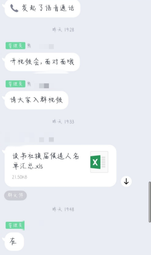 在13位同學(xué)的演講結(jié)束后,會(huì)議進(jìn)入第二個(gè)議程,新干事退出群聊,由指導(dǎo)老師和18級(jí)正副社長進(jìn)行討論確定每個(gè)崗位最合適的人選,并由雷榕芳社長在新思想讀書社工作群中公示名單。