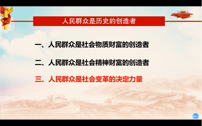 同學們進行視頻交流后,胡濟林老師進行了《人民群眾是歷史的創(chuàng)造者》的專題報告。胡濟林老師從“人民群眾是社會物質財富的創(chuàng)造者”、“人民群眾是社會精神財富的創(chuàng)造者”、“人民群眾是社會變革的決定力量”三個方面向我們講述了為什么人民群眾是歷史的創(chuàng)造者。通過學習,我們認識到人民群眾是一個歷史范疇,是指一切對社會歷史起著推動作用的人們。人民群眾是中國共產(chǎn)黨的執(zhí)政之基、力量之源。