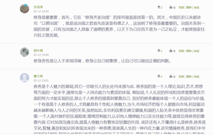《修身篇》是《習(xí)近平用典》的第四篇,在這篇中,習(xí)近平總書記引用名言典故,強(qiáng)調(diào)了領(lǐng)導(dǎo)干部“修身”的重要性,深刻闡述了修身立德的方法。指導(dǎo)老師江洪老師通過(guò)線上觀看視頻、在線討論、提問(wèn)、觀看PPT等形式開(kāi)展這次課的學(xué)習(xí),使同學(xué)們對(duì)“修身自律”有了更深的理解,教導(dǎo)同學(xué)們要“吾日三省吾身”,做到自重、自省、自警、自勵(lì),實(shí)現(xiàn)慎獨(dú)、慎微、慎初、慎友。