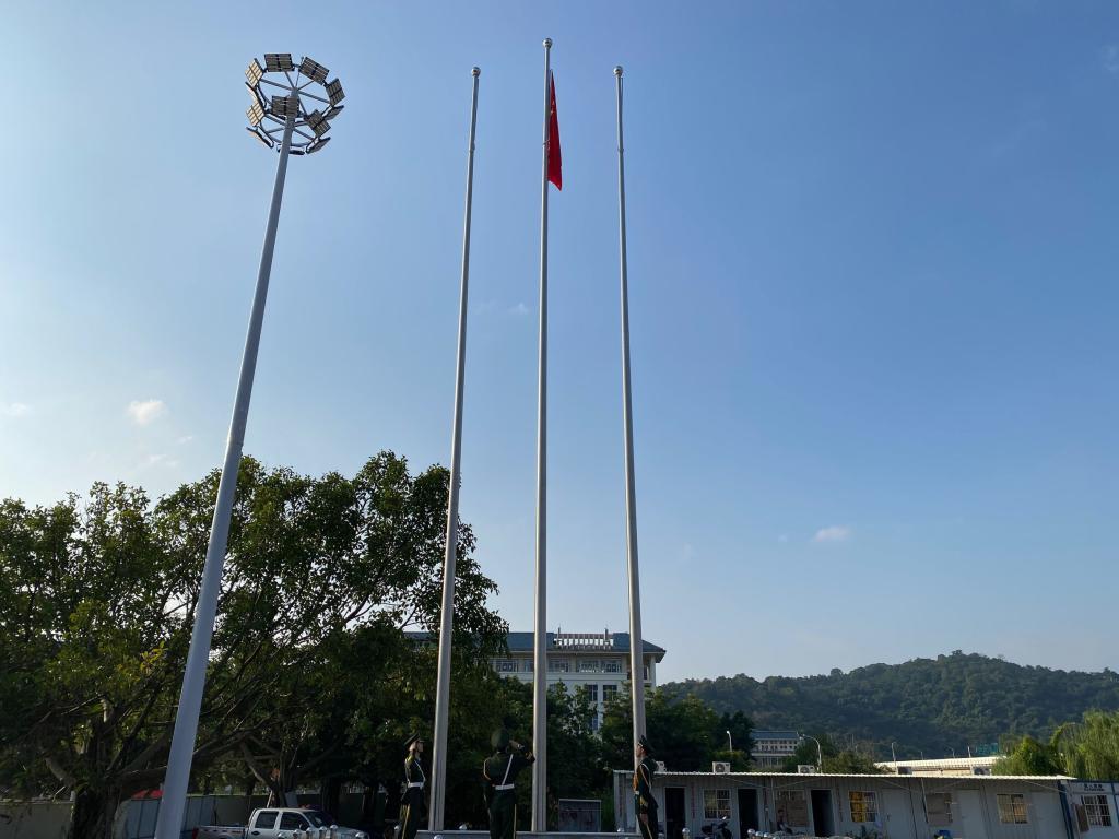 6點(diǎn)30分,升國(guó)旗儀式正式開(kāi)始,八一學(xué)社國(guó)旗護(hù)衛(wèi)隊(duì)踏著整齊劃一、鏗鏘有力的步伐,護(hù)送鮮艷的五星紅旗入場(chǎng),全體社員面向國(guó)旗莊嚴(yán)肅立,行注目禮。伴隨著雄壯激昂的《義勇軍進(jìn)行曲》,國(guó)旗冉冉升起,迎風(fēng)飄揚(yáng),全體社員齊唱國(guó)歌,向國(guó)旗致敬,共同祝福祖國(guó)母親生日快樂(lè)。