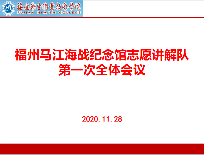 經(jīng)過層層選拔,福州馬江海戰(zhàn)紀念館志愿講解隊迎來了新成員。2020年11月28日下午,福州馬江海戰(zhàn)紀念館志愿講解隊在行政樓107會議室召開本學(xué)期第一次全體會議。會議由講解隊指導(dǎo)老師江洪老師主持,講解隊全體成員參加了會議。