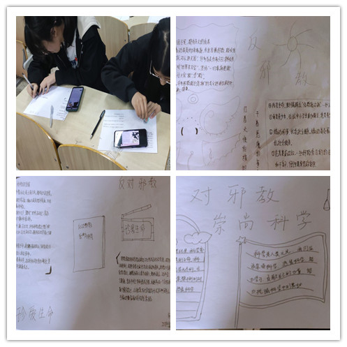 本次活動的另外一個重要環(huán)節(jié)是開展崇尚科學(xué)打擊邪教主題宣傳活動,我們一同觀看了反邪教視頻《如果識別和防范邪教——“對邪教說不”》,讓隊員們了解到了什么是邪教、邪教組織的特征、邪教的危害、當(dāng)前我國較為活躍的邪教組織等幾個方面的內(nèi)容。隊員們根據(jù)視頻內(nèi)容和對邪教組織的一些認(rèn)識繪制手抄報,他們發(fā)揮自己的聰明才智,用自己手中的筆繪制了一幅幅圖文并茂,并能表達(dá)自己崇山科學(xué)、抵制邪教的思想,這些作品雖然筆墨稚嫩,但主題突出鮮明,構(gòu)思精巧,充分地展現(xiàn)夢之隊隊員的才華。