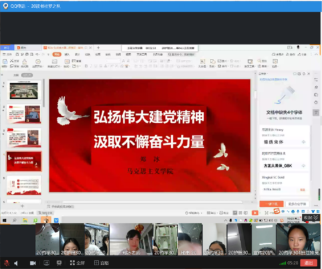 2021年9月29日晚7點,習近平新時代中國特色社會主義思想讀書社夢之隊在馬克思主義學院鄭冰老師的組織下,在線上開展“弘揚偉大建黨精神 汲取不懈奮進力量”專題宣講活動。
