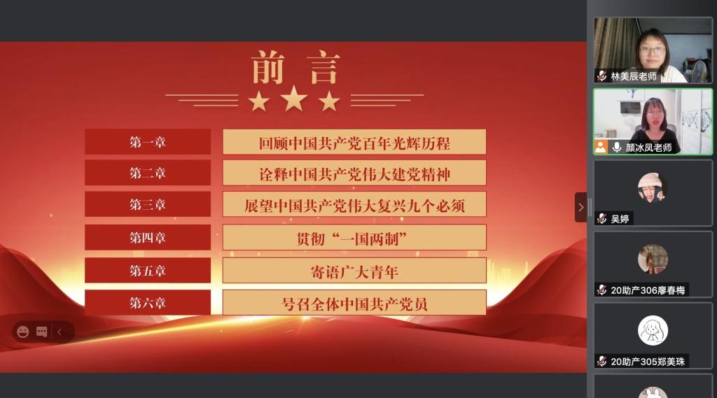 為進(jìn)一步推進(jìn)學(xué)習(xí)、宣傳和貫徹習(xí)近平總書記“七一”重要講話精神,引導(dǎo)社團(tuán)成員深入領(lǐng)會講話精神的重大意義,深刻把握豐富內(nèi)涵,不斷提高政治判斷力、政治領(lǐng)悟力、政治執(zhí)行力,為實現(xiàn)中華民族偉大復(fù)興的中國夢貢獻(xiàn)自己的青春力量,2021年10月8日晚,馬克思主義學(xué)院顏冰鳳、林美辰兩位老師為傳統(tǒng)節(jié)日研習(xí)社全體成員開展了線上學(xué)習(xí)宣講。