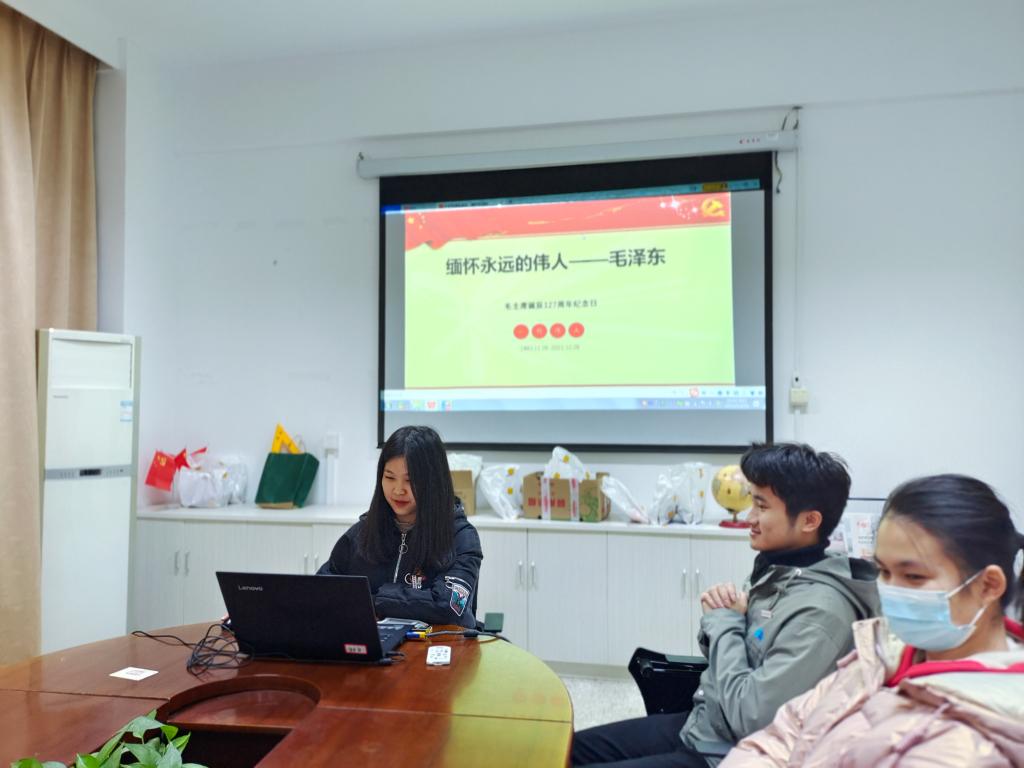 為了銘記光輝歷史、緬懷一代偉人、傳承紅色基因,培養(yǎng)民族精神和愛國情懷,2021年12月26日,習近平新時代中國特色社會主義思想讀書社原夢隊在行政樓107會議室開展了“紀念毛澤東誕辰128周年”讀書活動。原夢隊指導老師羅蕓及全體原夢隊隊員參加活動。