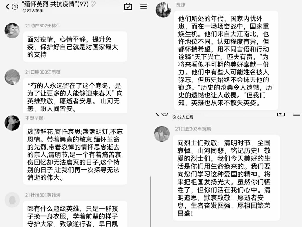 清明節(jié)又稱踏青節(jié)、行清節(jié)、三月節(jié)等,在仲春與暮春之交,是中華民族傳統(tǒng)隆重盛大的春祭節(jié)日。疫情當(dāng)前,為了緬懷革命英烈精神,繼承先烈的遺志,感受清明節(jié)的節(jié)日內(nèi)涵,緬懷抗擊疫情一線犧牲的醫(yī)護(hù)人員和工作人員,致敬疫情阻擊戰(zhàn)中的“逆行英雄”。我校傳統(tǒng)節(jié)日研習(xí)社于2022年4月7日組織同學(xué)們開展了以“緬懷先烈,共抗疫情”為主題的線上清明紀(jì)念活動(dòng)。