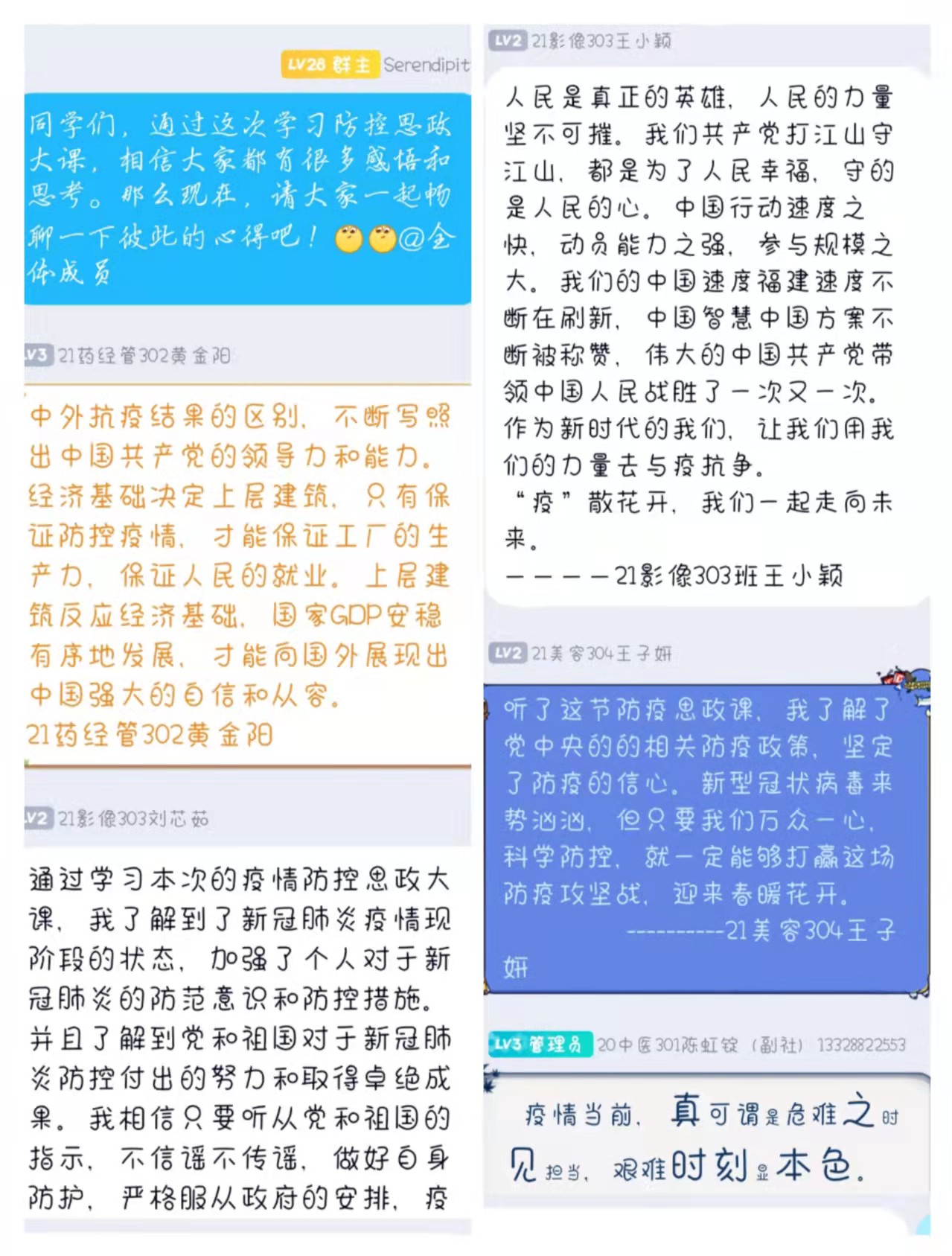 線上課程結(jié)束之后,同學們感受頗深,展開了積極的討論,同學們在感嘆黨和人民政府偉大的同時,還下定決心要為這次抗疫戰(zhàn)爭作出自己的貢獻,他們表示:“大家作為年輕的一代,要向這些舍己為人、投身一線的醫(yī)務工作者們學習,不僅是學習專業(yè)知識,更是要繼承他們身上為國家、為社會、為人民奉獻的精神和圣潔光輝?!痹谥T多這樣的豪情壯語下,活動達到了高潮。