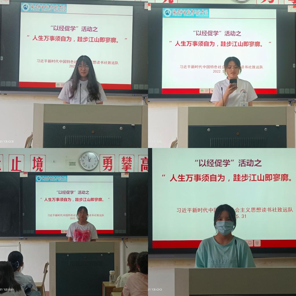 2022年5月31日下午,習(xí)近平新時(shí)代中國(guó)特色社會(huì)主義思想讀書社致遠(yuǎn)隊(duì)在江洪老師的組織下在教學(xué)樓102教室開展“‘以經(jīng)促學(xué)’之‘人生萬事須自為,跬步江山即寥廓’”社團(tuán)活動(dòng),社團(tuán)成員們都按時(shí)參加了此次活動(dòng)。