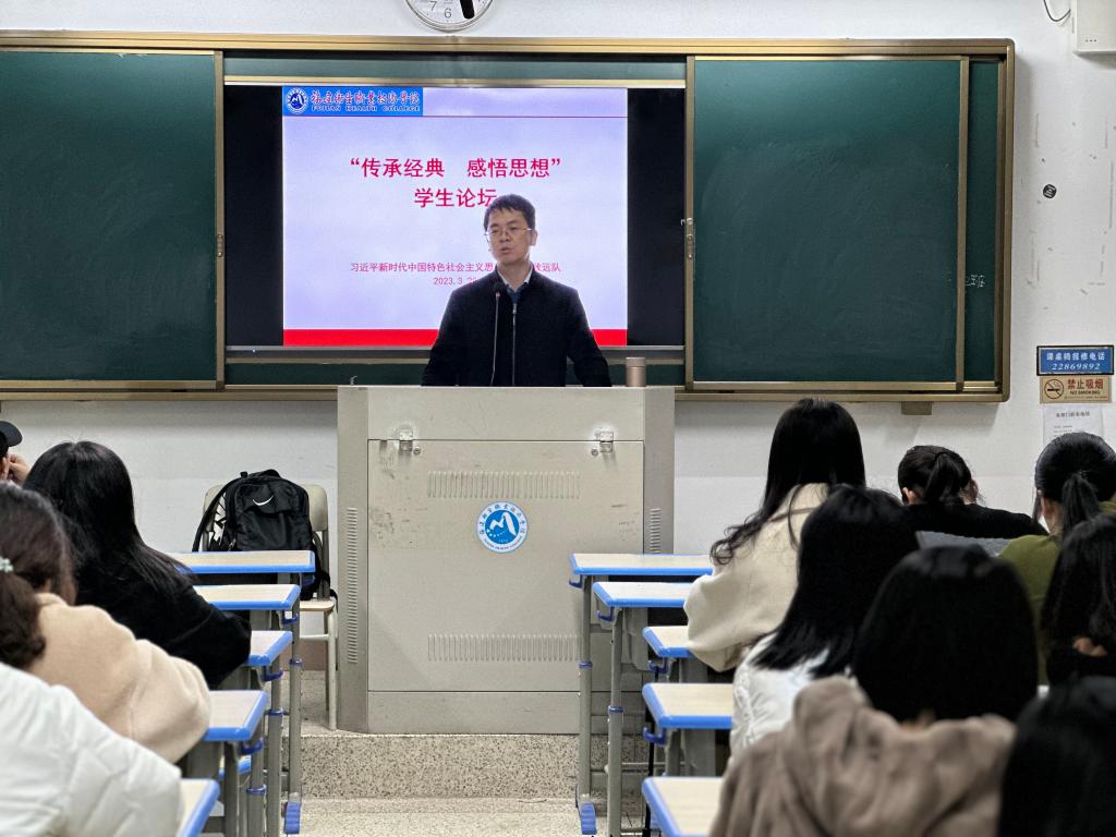 2023年3月28日,習近平新時代中國特色社會主義思想讀書社致遠隊在教學樓302圍繞教材《習近平用典》開展“傳承經(jīng)典 感悟思想”學生論壇課堂實踐活動?;顒佑芍笇Ю蠋熃橹鞒?,全體選課學生參加了活動。
