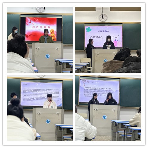 課前,學生按照要求,作了認真的準備。課堂上,學生按照分組順序,逐組上臺交流匯報。各組依次交流了“富貴不能淫,貧賤不能移,威武不能屈”“水之積也不厚,則其負大舟也無力”“茍日新,日日新,又日新”“己所不欲 勿施于人”“物有甘苦,嘗之者識;道有夷險,履之者知”“大鵬一日同風起,扶搖直上九萬里”等習近平總書記曾引用過的經(jīng)典,對典故進行深入的解讀、闡述。每組交流結束后,江洪都會對同學們的交流進行總結與點評,讓同學們有更深的感悟和理解。