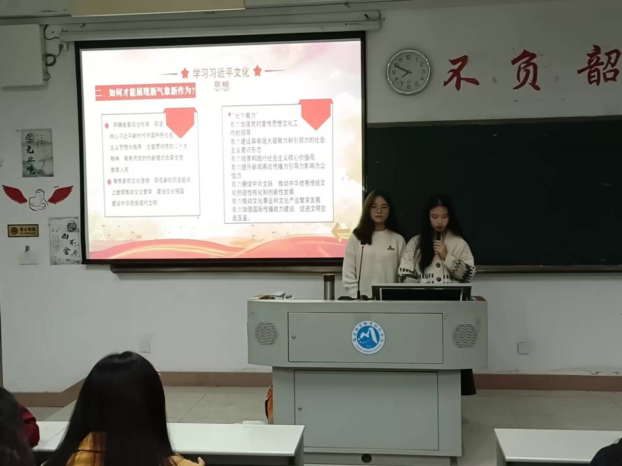 本次宣講人是22護理314的王雪蓮和23護理309的周詩妍,宣講的主題是“學習習近平文化思想,爭做新時代好青年”。王雪蓮首先從全國宣傳思想文化工作會議的召開入手,闡明習近平文化思想的由來和新發(fā)展,接著由周詩妍宣講,她從新青年與醫(yī)學專業(yè)的聯系出發(fā),呼吁我們當代青年擔起自己肩上的重任,為人民健康事業(yè)的發(fā)展貢獻自己的青春力量。最后,胡濟林進行精彩點評,希望同學們通過此次演講更加深入理解習近平文化思想,踐行社會主義核心價值觀,創(chuàng)建積極健康向上的校園文化。最后,本次宣講小組成員與老師合照。