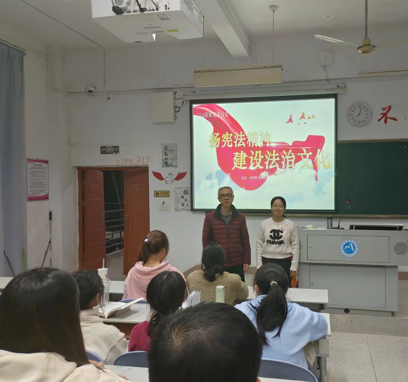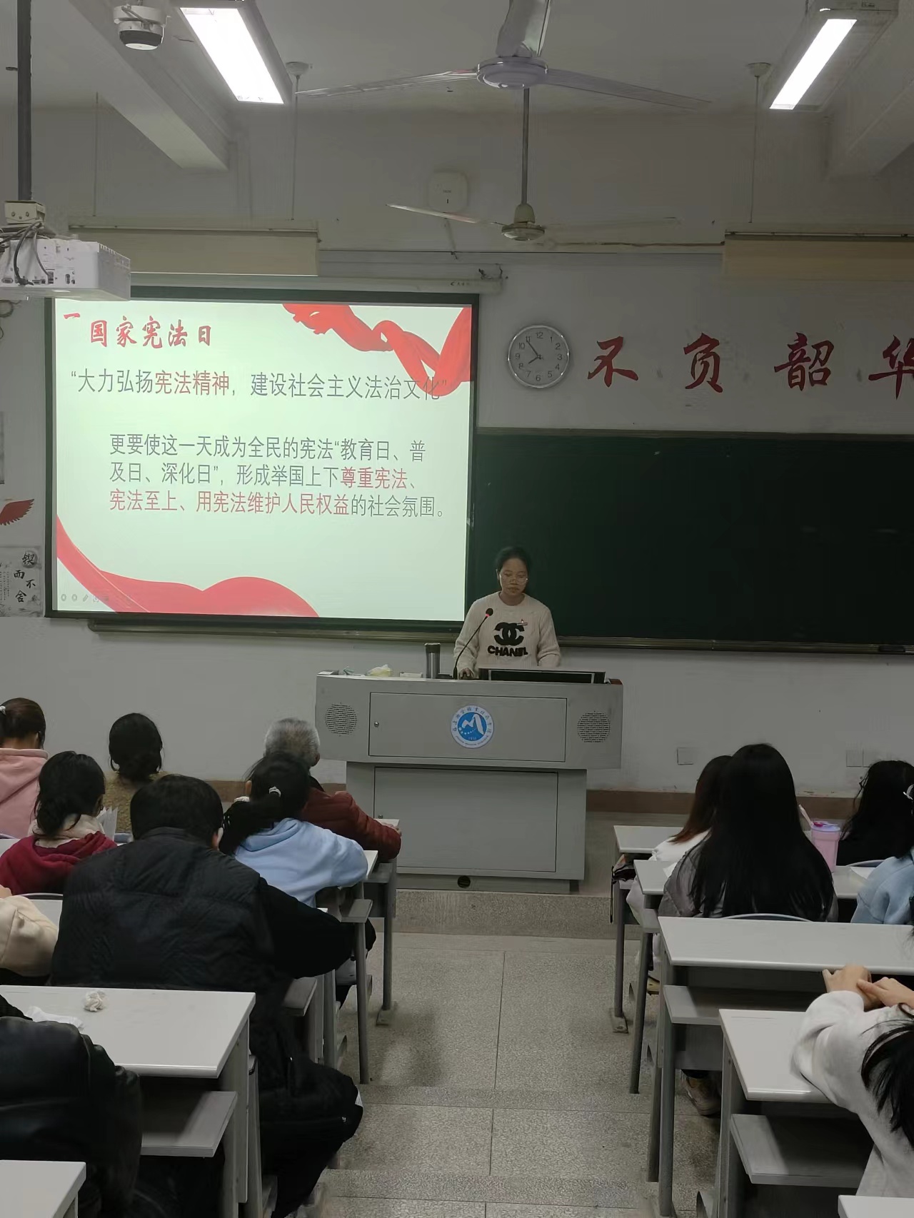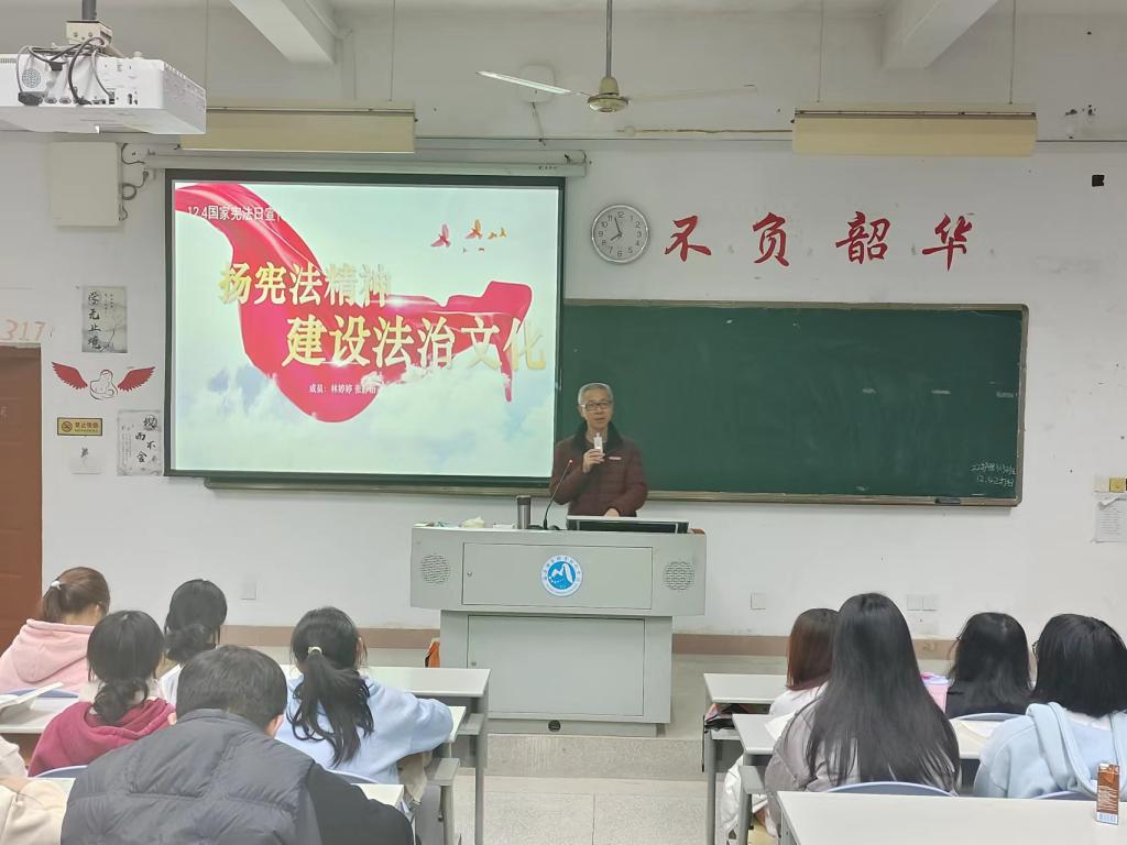 習(xí)近平總書記在黨的二十大報告中提出“完善以憲法為核心的中國特色社會主義法律體系”,明確了憲法在治國理政中的重要地位。為了增強同學(xué)們憲法意識,弘揚憲法精神,2023年12月4日,習(xí)近平新時代中國特色社會主義思想讀書社宣講團成員在胡濟林老師的組織下,到護理一階為同學(xué)們開展線下宣講交流。