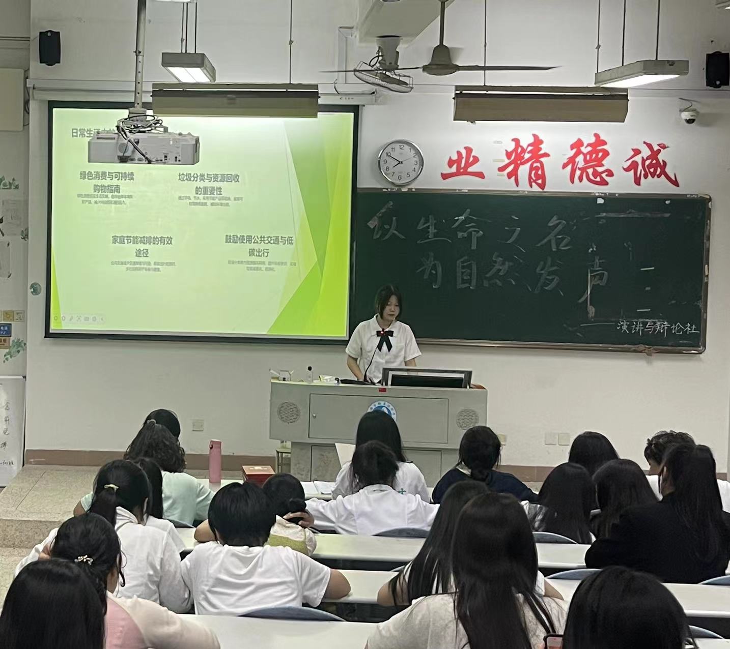 演講的現(xiàn)場,同學們的手勢伴隨著重點的強調(diào),時而揮動,時而攤開手掌,似乎在無聲地展示他的想法和情感,讓大家意識到環(huán)境問題的嚴峻性已經(jīng)到了不容忽視的地步。氣候變化導(dǎo)致的極端天氣事件頻發(fā),生物多樣性的喪失使得生態(tài)系統(tǒng)的穩(wěn)定性受到威脅。演講中,部分同學用事實和數(shù)據(jù)闡述了環(huán)境保護的緊迫性,臺下的同學則是不時點頭,表示贊同或是被某個觀點打動。