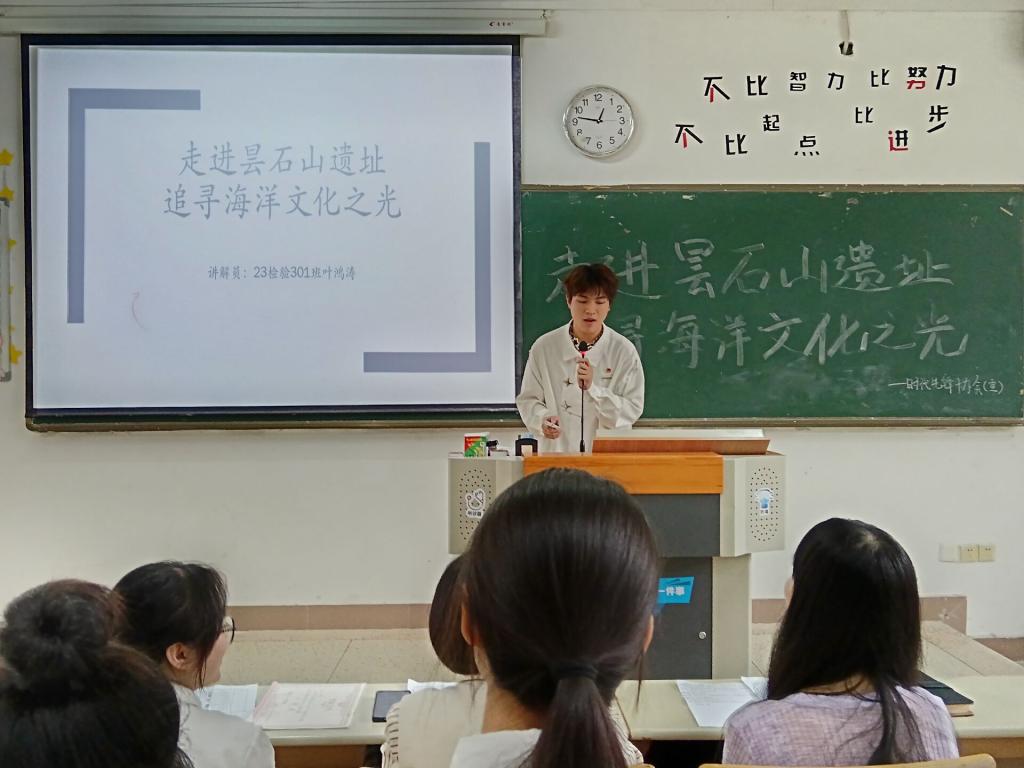 經(jīng)過歷時(shí)半月的選拔,15名參賽者脫穎而出,于2024年5月23日在崇教樓112教室參加“走進(jìn)曇石山遺址,追尋海洋文化之光”講解大賽半決賽。本次比賽由時(shí)代先鋒協(xié)會社長張芯語同學(xué)主持,社團(tuán)指導(dǎo)老師丁愛芝、張晨琳擔(dān)任評委。