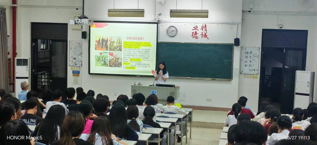 面對百年未有之大變局和世界范圍內各種思想文化的沖撞激蕩,我們唯有傳承紅色記憶,發(fā)揚紅色榮光,守住紅色血脈,才能站穩(wěn)腳跟、開創(chuàng)未來。為了更好地傳承長征精神,賡續(xù)紅色血脈,2024年5月20日,習近平新時代中國特色社會主義思想讀書社宣講團成員在胡濟林老師的組織下,到教學樓309為同學們開展線下宣講交流。