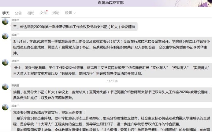 2020年4月1日,馬院黨支部全體黨員在線上召開2020年第一季度意識形態(tài)工作會議,會議由馬院支部書記熊美蘭主持,全體支部黨員參加了會議。