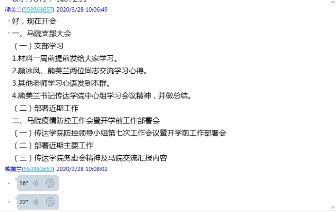 2020年3月28日上午,直屬馬克思主義學(xué)院黨支部召開線上黨員大會(huì),集中學(xué)習(xí)《新時(shí)代高等學(xué)校思想政治理論課教師隊(duì)伍建設(shè)規(guī)定》《教育部有關(guān)部門負(fù)責(zé)人就<新時(shí)代高等學(xué)校思想政治理論課教師隊(duì)伍建設(shè)規(guī)定>答問》等6份文件。會(huì)議由黨支部書記熊美蘭主持,全體教師黨員參加了會(huì)議。教師們?cè)跁?huì)議上暢談心得和感想,掀起學(xué)習(xí)討論熱潮。