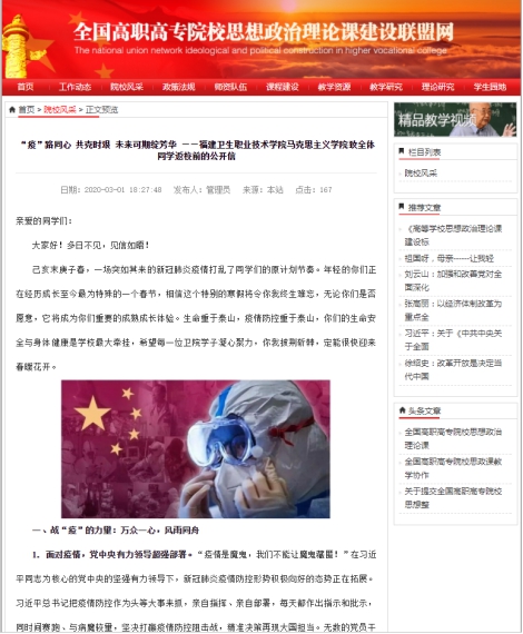 【全國(guó)高職高專院校思想政治理論課建設(shè)聯(lián)盟網(wǎng)??】【福建高校思政網(wǎng)】“疫”路同心 共克時(shí)艱 未來(lái)可期綻芳華