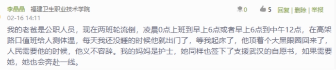 榜樣不僅在遠(yuǎn)方,也在我們身邊。這次疫情,或許我們才發(fā)現(xiàn)我們的父母不僅屬于我們的,他們更是屬于人民的,更是屬于國家的。除了我們的父母,還有我們的學(xué)長學(xué)姐。