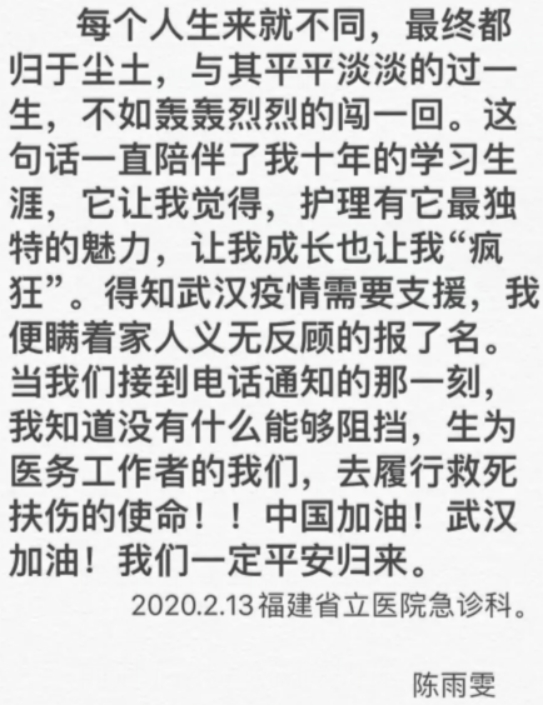 在出發(fā)的時(shí)候,她寫到:“每個(gè)人生來就不同,最終都?xì)w于塵土,與其平平淡淡的過一生,不如轟轟烈烈的闖一回。這句話一直陪伴我十年的學(xué)習(xí)生涯,它讓我覺得,護(hù)理有它最獨(dú)特的魅力,讓我成長也讓我“瘋狂”。得知武漢疫情需要支援,我便瞞著家人義無反顧的報(bào)了名,當(dāng)我們接到電話通知的那一刻,我知道沒有什么能夠阻擋,生為醫(yī)務(wù)工作者的我們,去履行救死扶傷的使命!中國加油!武漢加油!我們一定平安歸來?!边@不是豪言壯語,而是作為一名護(hù)理人員發(fā)出的心聲,她僅想用自己所學(xué)到的知識(shí)多就一些人。