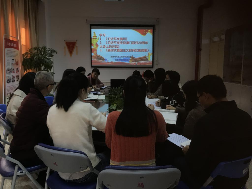 2019年12月26日上午,直屬馬克思主義學(xué)院黨支部組織全體黨員集中學(xué)習(xí)《習(xí)近平在福州》、《習(xí)近平在慶祝澳門回歸20周年大會(huì)上的講話》、《新時(shí)代愛(ài)國(guó)主義教育實(shí)施綱要》?;顒?dòng)由黨支部書記熊美蘭主持,支部全體教師黨員參加了活動(dòng)。