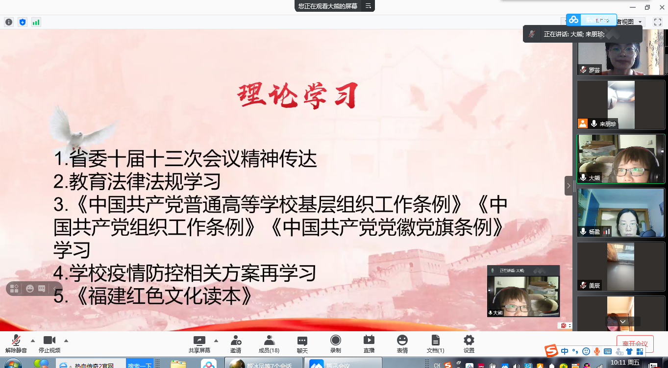 2021年8月13日上午,直屬馬克思主義學(xué)院黨支部全體黨員齊聚“云端”開展線上理論學(xué)習(xí),活動(dòng)由黨支部書記熊美蘭主持。