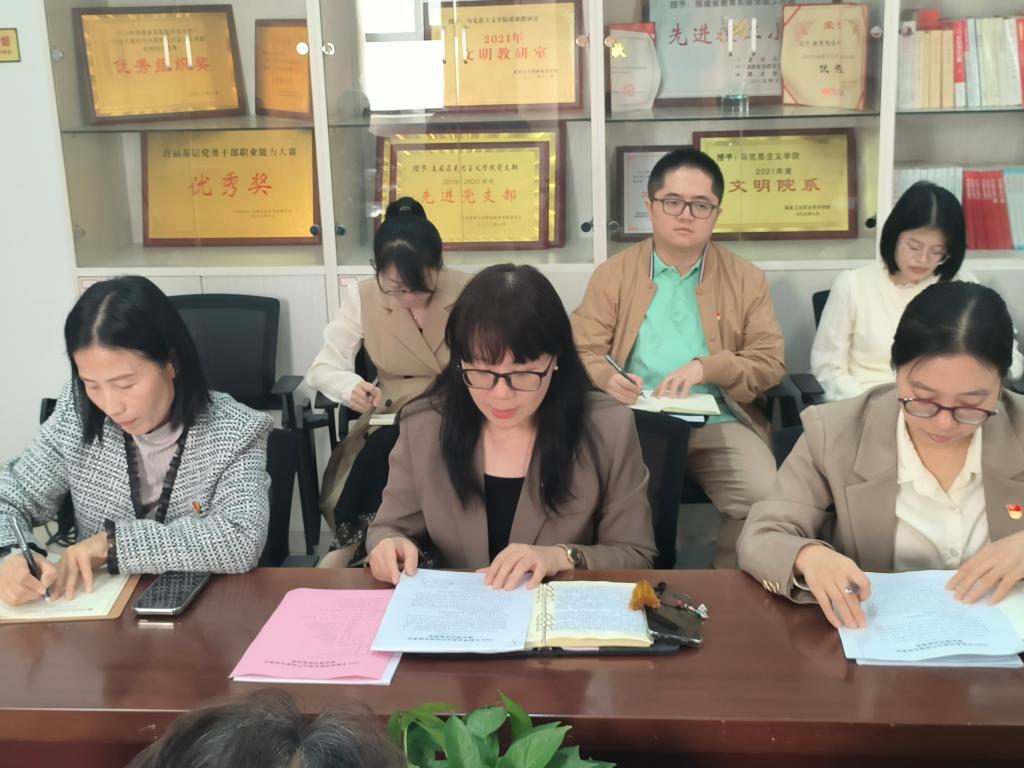 院黨總支書記熊美蘭從“壓緊壓實責任鏈條,著力扛起政治擔當”“深學細悟理論精髓,著力筑牢思想支柱”“黨建領航融匯力量,著力深耕育人主業(yè)”三個方面對馬院全面從嚴治黨主體責任落實情況進行了詳細匯報,同時對黨建業(yè)務融合、關鍵課程建設、黨員隊伍建設等工作中存在的問題與不足進行了深入的剖析,并提出了下一步工作思路。