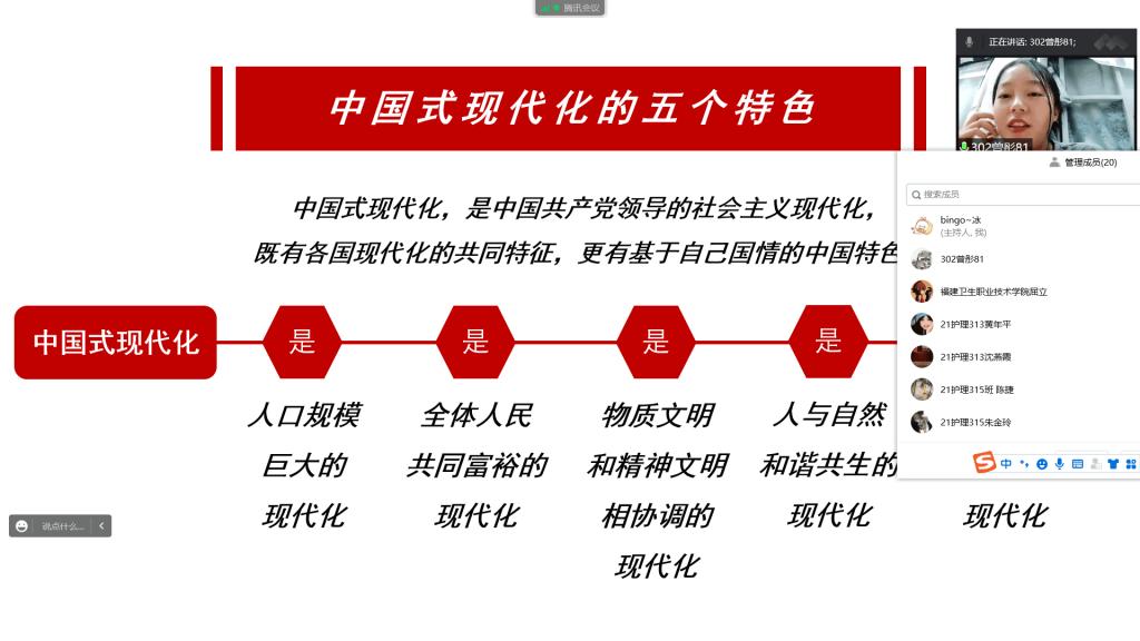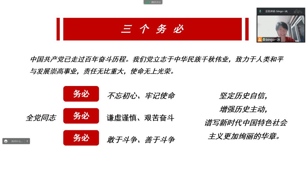 鄭冰首先介紹了大會的主題,引人入勝,明確同學(xué)們的學(xué)習(xí)方向。講述了中國共產(chǎn)黨走過的百年奮斗歷程,以及中國共產(chǎn)黨立志于中華民族千秋偉業(yè),致力于人類和平與發(fā)展的無上光榮的使命,據(jù)此引出全黨同志的三個務(wù)必和黨十年來所干的三件大事以及黨的中心任務(wù)。通過五個特色的描述,讓我們明確何為中國式現(xiàn)代化,以及前進道路上我們必須牢牢把握的五個重大原則等重要內(nèi)容。