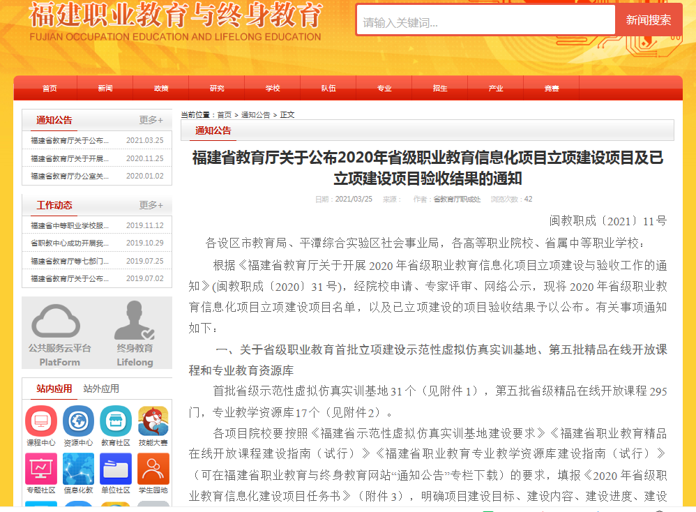 近日,福建省教育廳職成處公布了2020年省級(jí)職業(yè)教育信息化項(xiàng)目立項(xiàng)建設(shè)項(xiàng)目名單,我校護(hù)理學(xué)院龔海蓉老師主持申報(bào)的《護(hù)理學(xué)基礎(chǔ)》、藥學(xué)院何舒瀾老師主持申報(bào)的《天然藥物學(xué)基礎(chǔ)與應(yīng)用》和醫(yī)學(xué)系張?zhí)N老師主持申報(bào)的《經(jīng)絡(luò)與腧穴》3個(gè)項(xiàng)目獲得“第五批省級(jí)職業(yè)教育精品在線開(kāi)放課程”立項(xiàng)。