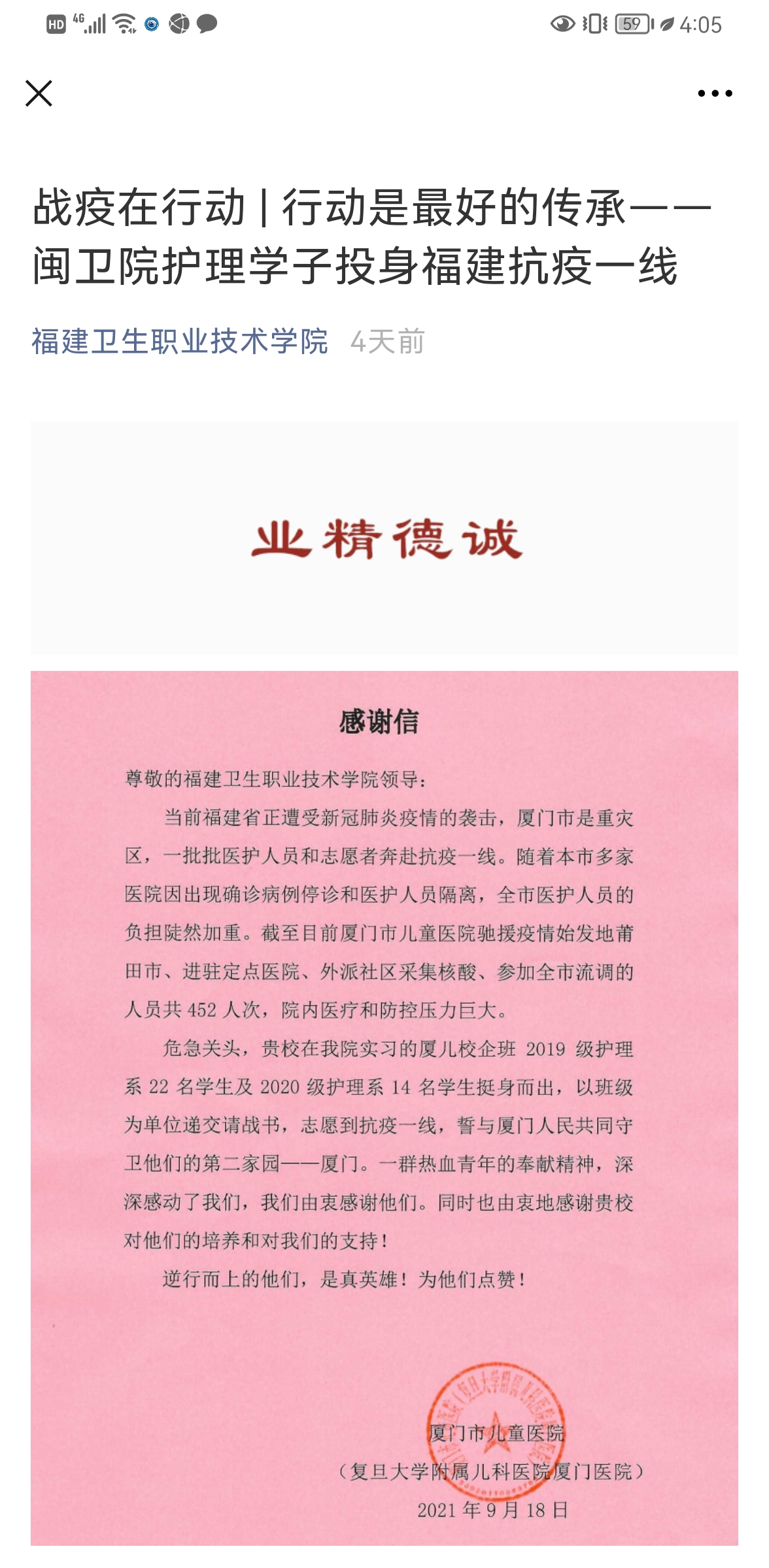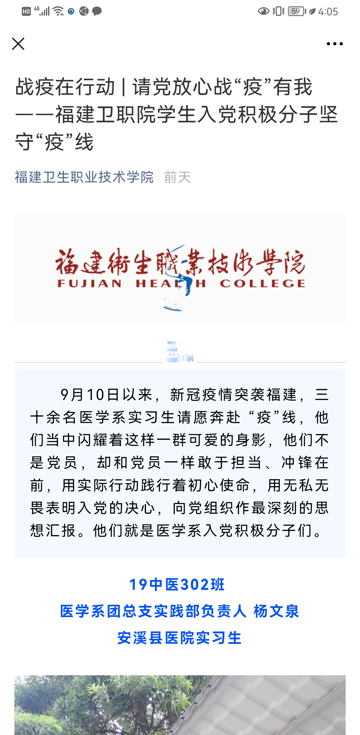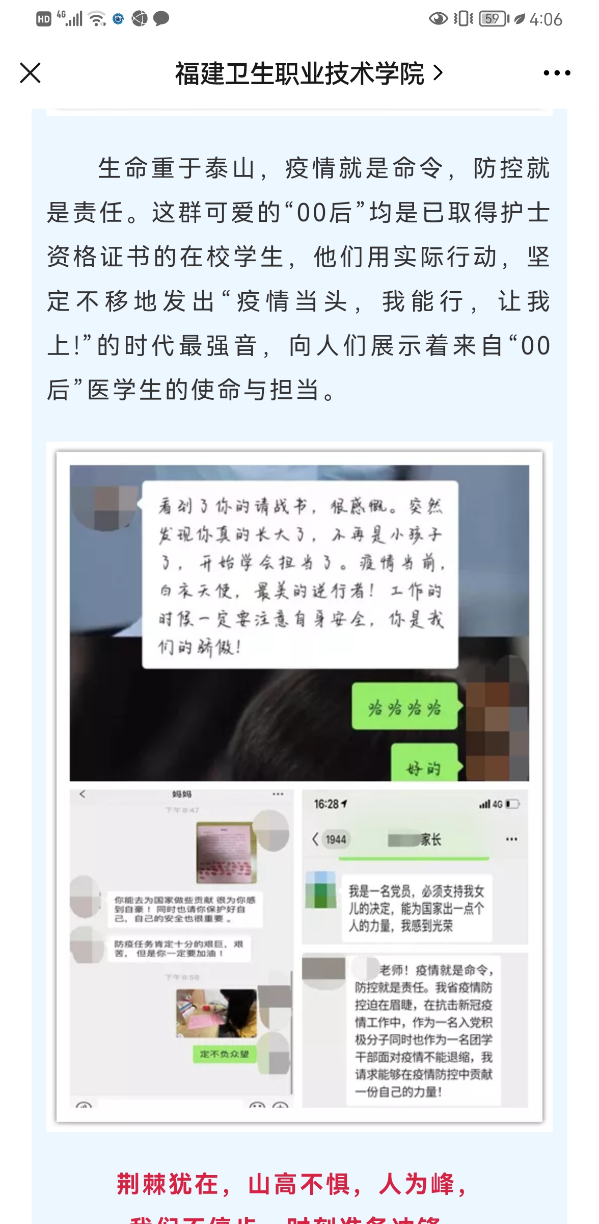 為進(jìn)一步引導(dǎo)未來的醫(yī)藥衛(wèi)生工作者正確面對(duì)疫情,積極號(hào)召同學(xué)們學(xué)習(xí)白衣天使們“疫”往無前,勇于擔(dān)當(dāng)?shù)木瘛H]o導(dǎo)員積極了解廣大實(shí)習(xí)生和畢業(yè)校友參加抗“疫”的故事和先進(jìn)事跡,依托校院兩級(jí)新媒體平臺(tái)廣泛宣傳,不斷堅(jiān)定青年學(xué)子的信心,進(jìn)一步弘揚(yáng)愛國奮斗精神,引導(dǎo)學(xué)生把“小我”融入“大我”,勤奮學(xué)習(xí),刻苦鉆研,上好疫情防控這堂思想政治大課。