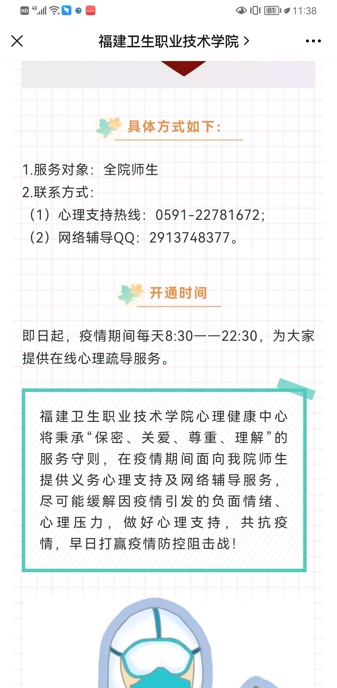 輔導(dǎo)員們還有另一個(gè)身份,他們也是中共黨員,我省疫情發(fā)生以后,他們迅速集結(jié)為學(xué)生管理黨員突擊隊(duì),深入校園疫情防控的各個(gè)角落,關(guān)心學(xué)生的學(xué)習(xí)和生活,為學(xué)生排憂解難,處處飄揚(yáng)著鮮紅的黨旗。在這沒有硝煙的戰(zhàn)“疫”中,每位閩衛(wèi)院輔導(dǎo)員都心系學(xué)生,沖在前線,守崗履責(zé),踐行著身為一名高校輔導(dǎo)員的初心和使命。相信通過全校師生的共同努力,我們一定能夠打贏這場疫情防控保衛(wèi)戰(zhàn)。