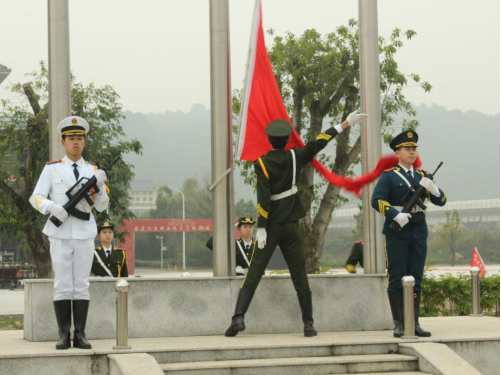 旗手振臂一揮,鮮艷的五星紅旗在威武雄壯的《義勇軍進行曲》中徐徐展開,全體在場師生目視五星紅旗冉冉升起,在熠熠晨光中迎風飄揚,愛國之情在師生們心中滌蕩。升旗儀式,學子們致敬五星紅旗,與國旗一同升起的還有對新學期、新時代的無限向往。