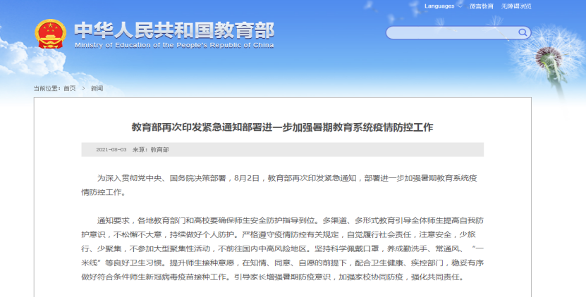 近期,國內新冠肺炎疫情病例數有所增加,教育部再次印發(fā)緊急通知,部署進一步加強暑期教育系統(tǒng)疫情防控工作。疫情防控無小事,防微杜漸是大事,請全體學生提高疫情防控意識,做好各類安全防護。