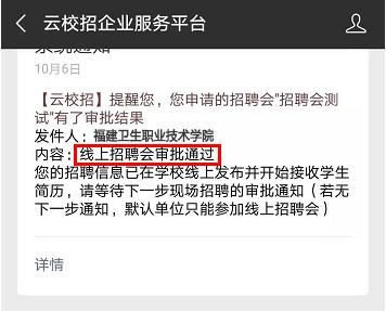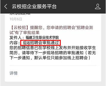 就業(yè)中心集中審核校園招聘會報名申請,原則上在規(guī)定時間內報名的用人單位,資質審核合格的,都能獲得線上招聘資格,最終的現(xiàn)場招聘單位名單確定將依據(jù)學校的實際情況和畢業(yè)生的求職需求,審核結果將通過企業(yè)微信端(云校招企業(yè)服務平臺)通知單位聯(lián)系人,審核結果分兩類:
