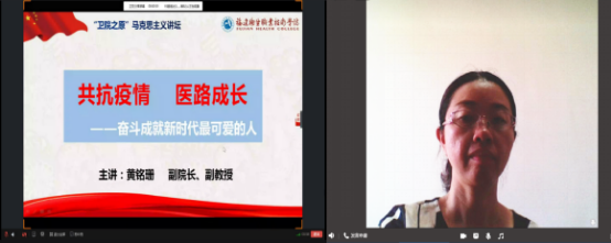 6月17日,醫(yī)學(xué)技術(shù)系第十八期業(yè)余分黨校培訓(xùn)班第七課開講,學(xué)院副院長黃銘珊擔(dān)任此次課程的主講人。本次課程的主題為“共抗疫情,醫(yī)路成長——奮斗成就新時(shí)代最可愛的人”。她為同學(xué)們深入介紹了在黨中央的統(tǒng)一領(lǐng)導(dǎo)與精準(zhǔn)施策下,全國人民眾志成城,我國疫情防控取得了階段性勝利,分享了奮斗在抗疫一線先鋒人物的典型事跡。黃銘珊副院長深情勉勵同學(xué)們,希望大家作為青年一代要有責(zé)任、有擔(dān)當(dāng)、有使命,銘記“業(yè)精德誠”校訓(xùn)精神,勤學(xué)苦練,勵志奉獻(xiàn),用過硬本領(lǐng)承擔(dān)起新時(shí)代賦予的責(zé)任。