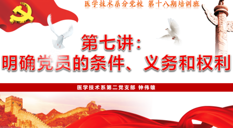 6月19日,醫(yī)學(xué)技術(shù)系第十八期業(yè)余分黨校培訓(xùn)班第八課開講,醫(yī)學(xué)技術(shù)系第二黨支部書記鐘偉雄擔(dān)任此次課程的主講人。本次課程的主題為“明確黨員的條件、義務(wù)和權(quán)力”。他為學(xué)員們深入解讀了成為一名黨員的基本條件,介紹了黨員的八項(xiàng)權(quán)利與義務(wù)。他強(qiáng)調(diào),黨員義務(wù)是黨對黨員的基本要求,是黨員條件的具體化,希望學(xué)員們在日常學(xué)習(xí)工作生活中能以一名合格黨員的具體標(biāo)準(zhǔn)要求自己不斷以實(shí)際行動向黨組織靠攏。
