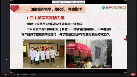 首先,黃銘珊副院長為同學們深入介紹了國內(nèi)外疫情的發(fā)展情況。她重點闡述了在黨中央的統(tǒng)一領(lǐng)導(dǎo)與精準施策下,全國人民眾志成城,我國疫情防控取得了階段性勝利。她還結(jié)合抗疫一線的典型案例,深入講述了在這場疫情防控阻擊戰(zhàn)中,全國各地的醫(yī)務(wù)工作者們、“兩山”醫(yī)院建設(shè)的工人們及其他各行各業(yè)奮斗們在抗疫一線的典型事跡。