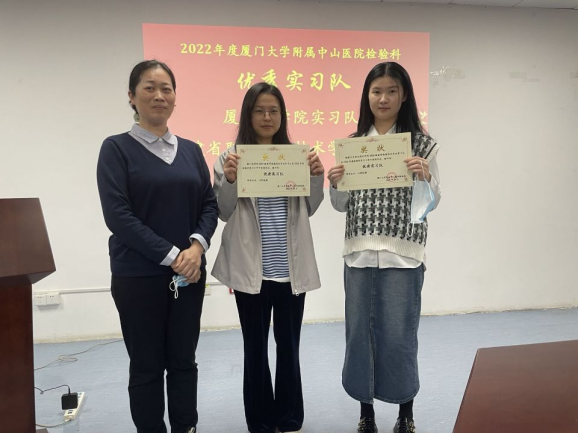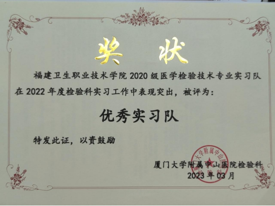 2023年3月30日,廈門大學(xué)附屬中山醫(yī)院檢驗(yàn)科為2023屆實(shí)習(xí)生舉辦表彰大會(huì),福建衛(wèi)生職業(yè)技術(shù)學(xué)院檢驗(yàn)專業(yè)實(shí)習(xí)隊(duì)獲得“優(yōu)秀實(shí)習(xí)隊(duì)”稱號(hào),20檢驗(yàn)301班洪馨同學(xué)與20檢驗(yàn)303班吳瑕同學(xué)獲評(píng)“優(yōu)秀實(shí)習(xí)生”。